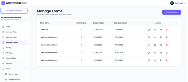 Click Save and Continue. You will receive a form link that you can share with users. When they submit the form, the pass will be generated with all the mapped form input values.